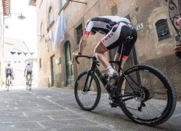 Cipressen, een landhuis op een heuvel en een pittoresk dorpje. Het decor dat 3T voor de introductie van haar allereerste frame had uitgekozen, ademde Italië in optima forma. Ondanks het Italiaanse karakter van de omgeving en het bedrijf, is de 3T Exploro het geesteskind van twee Nederlanders. De eigenaren van 3T, René Wiertz en Gerard Vroomen, willen met de Exploro in een niche duiken. Ze constateerden dat fietsfanaten (en zijzelf) steeds minder voor snelheid kiezen en meer het avontuur willen opzoeken. Daar passen gravelracers bij. Tuurlijk, die bestaan al een tijdje, maar in de ogen van Vroomen en Wiertz missen de modellen die tot nu toe geproduceerd worden het lekkere gevoel van een wegfiets. De houding en de ervaring van snelheid, die willen ze ook op andere ondergrond dan asfalt ervaren.Dat is heel goed gelukt. We voelden ons direct vertrouwd op de Exploro omdat onze houding precies zo was als op onze wegfiets. En hij oogt ook niet heel anders. Alleen de enorme banden laten zien dat dit een andere fiets dan normaal is. Ondanks die extreem dikke banden (650b-wiel met 2,1 inch banden) is hij wendbaar en snel. Dat was nodig ook, want we koersten over een Strade Bianche-parcours met stevige beklimmingen en technische afdalingen. Daar waar normaliter alleen mountainbikers zich omlaag storten, hield de Exploro prima stand. De Exploro is zeer aerodynamisch en omdat hij voor off-road bedoeld is, heeft 3T de luchtweerstand expres bij lage snelheden getest; 30 kilometer per uur. Dat merkten we natuurlijk niet tijdens het fietsen, maar in vergelijking met een mountainbike voelt de Exploro bijzonder snel, licht en soepel. En met een wegfiets hadden we ons nooit op deze wegen gewaagd. Ook op het asfalt heb je het gevoel dat je een aardig tempo kunt rijden, al zal een wegfiets altijd sneller zijn. Zo werden wij ondanks onze stevige inspanning op het asfalt bergop gewoon voorbijgereden door grijsaards op oude Bianchi’s.Snel en comfortabel