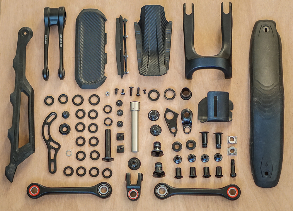 Natuurlijk zijn er ook bijzonderheden die de wenkbrauwen doen fronsen. Zo is het ventiel van de achterdemper eigenlijk niet goed bereikbaar zonder je frame te beschadigen. Ook stond ik er van versteld dat de bouten waarmee de achtervork aan elkaar zitten allemaal net even anders zijn. Niet veel, maar net genoeg om niet uitwisselbaar te zijn. Waarom?