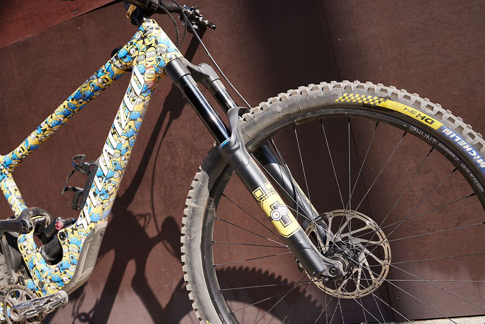 Het totaal bleek bombproof, maar heavy: 15,6 kilo geeft de weegschaal aan. De Michelin DH-banden van dik 1500 gram per stuk en aluminium Hunt-wielset van 2050 gram dragen daar voor een groot deel aan bij. De fiets is dan ook niet gebouwd om prijzen mee te winnen berg op. Al moet je er wel degelijk goed mee kunnen klimmen.Setup