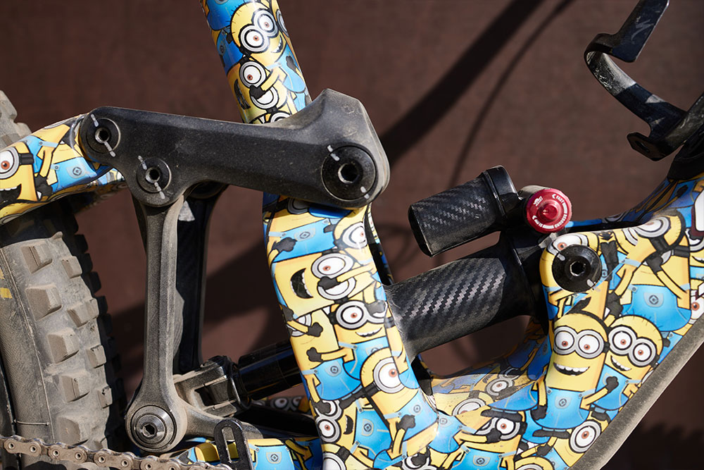 We hebben net al even aangehaald dat de Enduro niet bepaald een lichtgewicht is. Het voordeel hiervan is dat alles tegen een stootje kan. Meestal ging het goed, maar de fiets heeft ook genoeg te verduren gehad. Geen krimp. Een seizoen lang probleemloos fietsen. Alleen het onderste balhoofdlager bleek na inspectie versleten. Een goede score na zoveel wortels, keien en crashes. De Minion-wrap heeft het frame goed beschermd, als nieuw kwam de originele kleur uit zijn jasje.
