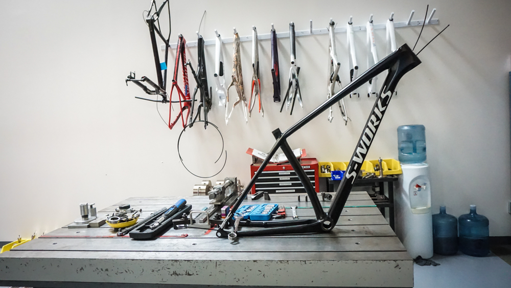 Inmiddels weten ze daar beter. De afgelopen drie jaar is er gewerkt aan een nieuwe Epic hardtail. Lager gewicht, betere stuureigenschappen en vooral een meer plezierige rijbeleving. Ook tijdens het afzien. Een compleet nieuw frame is ontwikkeld. Hierbij is gebruik gemaakt van Fact 12m carbon. Over het hele frame worden ruim 31 soorten lay ups en soorten carbon gebruikt. Deze worden met ruim 12 verschillende samenstellingen epoxy tot een frame omgetoverd. Zoals een goed stuk vlees op de barbeque bij vrienden duurt het even voor dit proces vervolledigd is. Ruim 8 uur is er nodig om een frame ‘op te bouwen’ en als warme broodjes af te bakken. Op 50 graden om precies te zijn. Ik krijg carbon bijles. Dan Lister, Fabrication Lab Manager bij het R&D center van Specialized laat zien hoe complex het is om zo’n carbon frame op te ontwikkelen en op te bouwen.