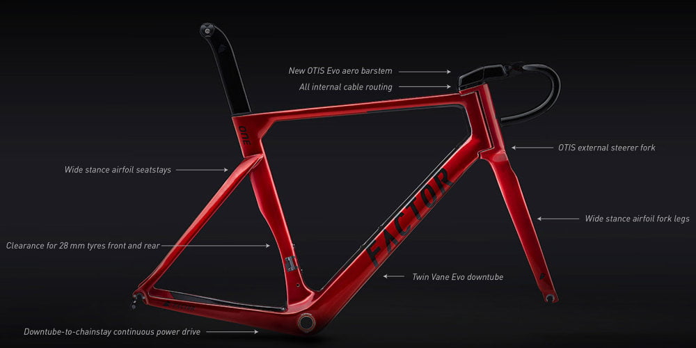 Ook de schuine buis is bijzonder van vorm (Twin Vane EVO), wat volgens Factor een betere luchtstroom en minder aerodrag tot gevolg heeft. De vorkpoten hebben een ‘wide stance construction’ die plaats biedt aan 28mm banden. Hetzelfde uiteraard bij de achtervork.