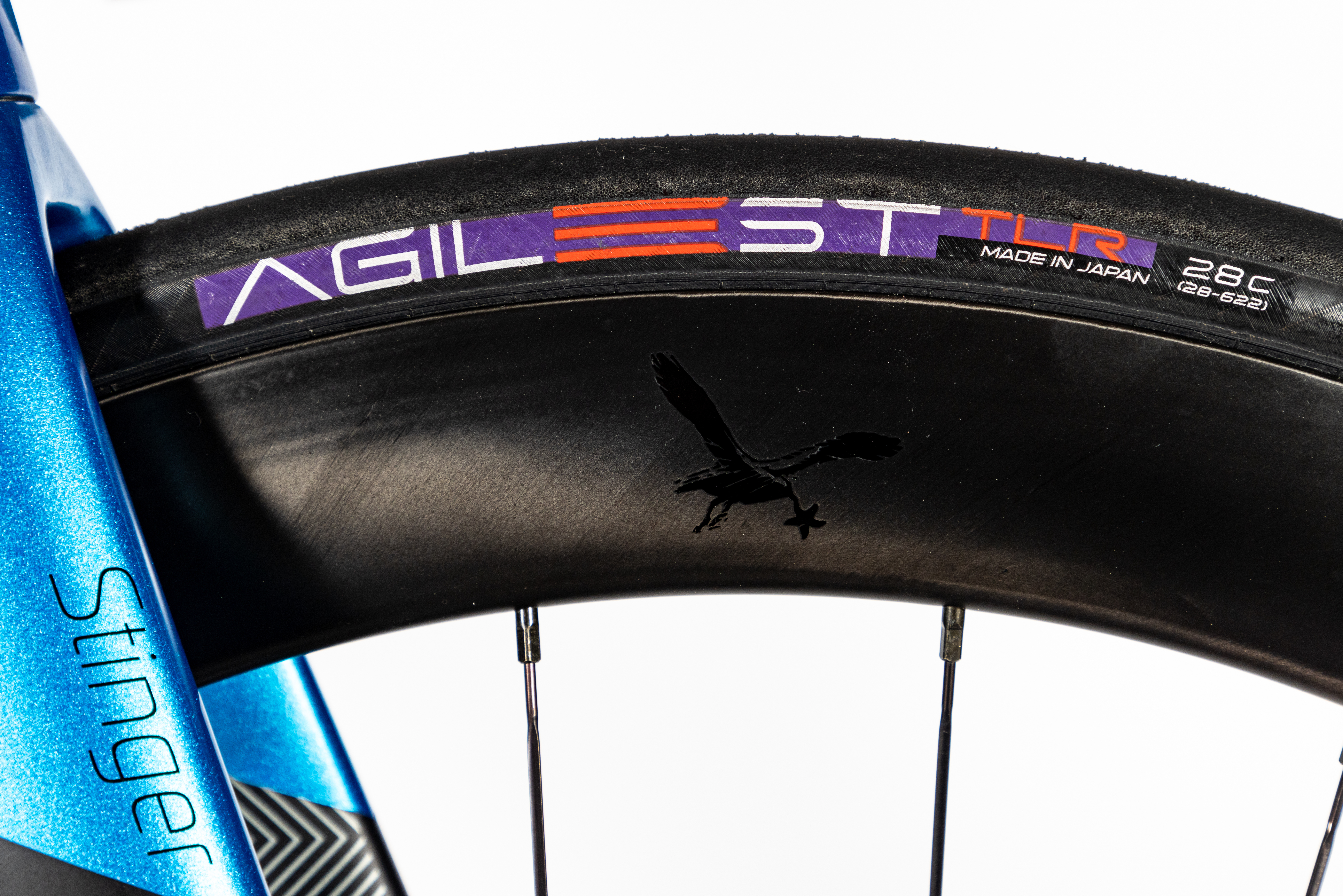 De hoge aerovelgen van de tubeless Gabbiano-wielen geven de fiets een stoer uiterlijk. Natuurlijk zitten er Japanse Panaracer-banden op – van 28 millimeter, dat past perfect bij de fiets. Shimano 105 was ooit een beginnersgroep, nu is het een volwaardige, volwassen set. Deze elektronische Di2-versie voelt als zijn duurdere Ultegra-broer. De Stinger heeft hydraulische remmen met voor een 160 millimeter-schijf en achter 140 millimeter. Het stuur is van Zipp en de stuurpen van FSA. De kabels lopen onder de stuurpen het frame in. Op zo’n fiets had ik eigenlijk een aero cockpit verwacht, met een stuur en stuurpen uit één stuk. Niet dat de huidige set-up lelijk is, verre van dat, maar zo’n cockpit had het net iets extra’s gegeven.