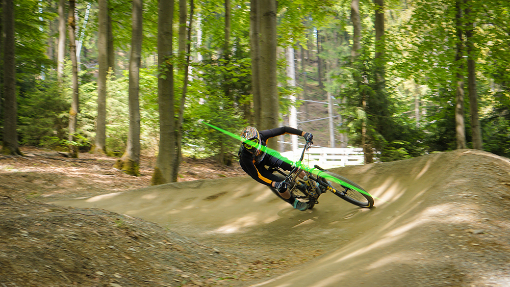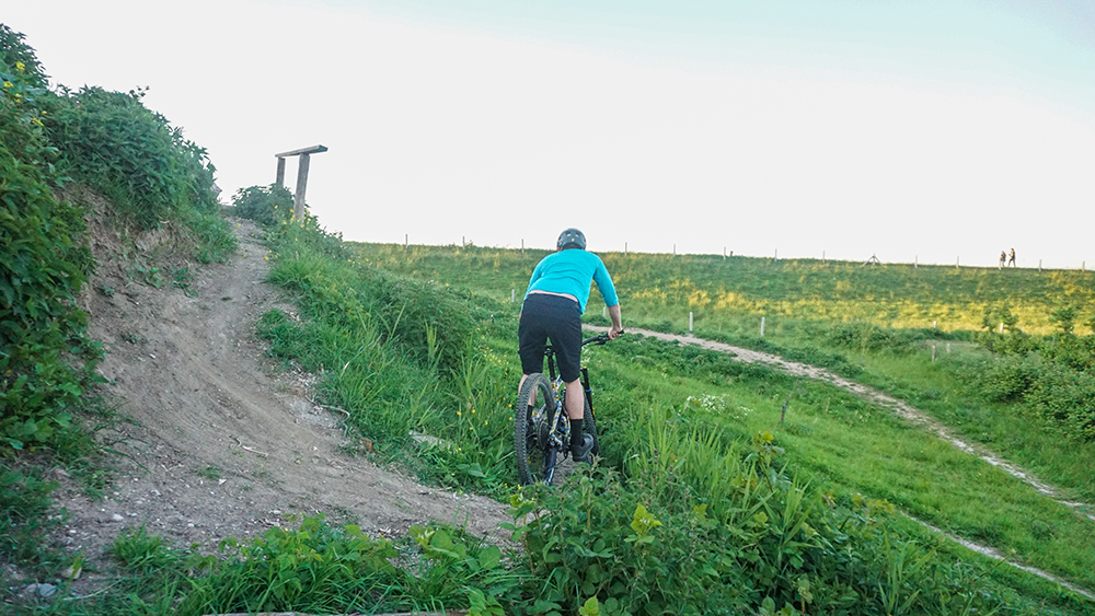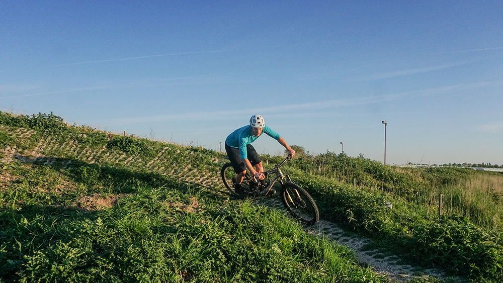 Meestal zijn dit soort ‘wandjes’ redelijk steil. Om hier makkelijk tegenaan te sturen maak je een soort bunnyhop zoals we hier hebben uitgelegd. Druk van het voorwiel en rollen maar. Hierdoor wordt niet alleen de bocht ruimer, ook maak je wat extra vaart.