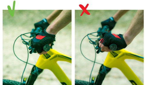 Houd je polsen in lijn met je onderarm. Zak je door je polsen, dan kan dit na geruime tijd problemen met de doorbloeding geven. Bovendien kun je stevige klappen niet goed opvangen. Heb je last van veel druk op je handen? Dan is je gewichtsverdeling op de fiets waarschijnlijk niet goed. Misschien zit je te diep of te ver naar voren. Als het lastig is om je handen in de goede positie te houden, kies dan grippers met meer ondersteuning, bijvoorbeeld van Ergon of BBB. Je duimen moet je onder de handvatten houden. Doe je dit niet, dan is de kans groot dat je hand van het stuur schiet als je door een kuil rijdt.
