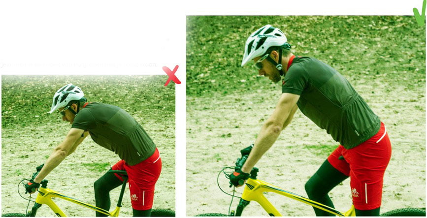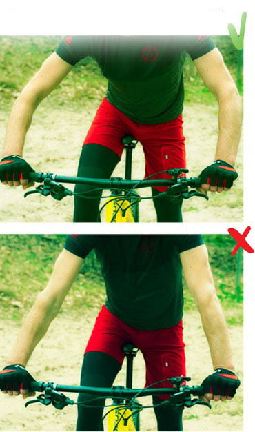 In ruig terrein kun je je armen gebruiken om de eerste klappen goed op te vangen. Je moet dan wel met iets gebogen ellebogen rijden. Zet je je armen op slot, dan werkt de belasting meer door op de rest van je lichaam. Vooral je nek en rug krijgen het dan zwaar te verduren.
