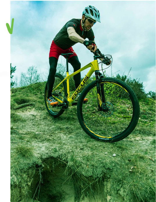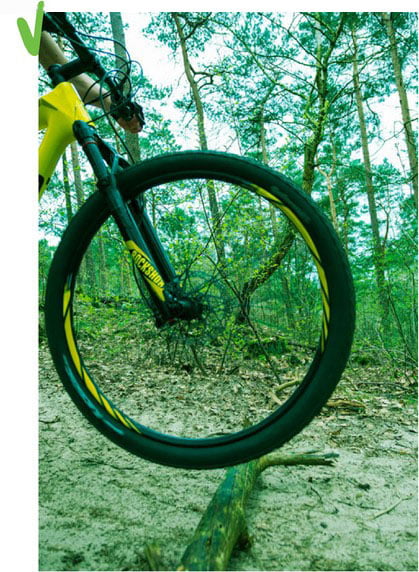 Ligt er een forse tak op het pad of steekt een boomwortel flink uit? Er is een effectieve manier om deze niet al te hoge obstakels te bedwingen: » Trek je voorwiel op met je armen en breng, terwijl je op de pedalen staat, je lichaamsgewicht iets naar achteren. Zo krijg je je voorwiel over het obstakel zonder dat hij er tegenaan knalt » Haal vervolgens op het juiste moment de druk van het achterwiel, zodat je achterband het obstakel niet raakt. Op deze manier voorkom je een stootlek of een beschadigde velg. De hindernis mag niet te hoog zijn, want anders loop je het risico dat deze je voorbladen raakt. En dat is een dure én pijnlijke grap. Bunny hop Bij hoge obstakels biedt een bunny hop uitkomst, maar dat vergt wel wat techniek en oefening. Net zoals veldrijders eindeloos hebben geoefend om over die balkjes te kunnen springen. De techniek van de bunny hop is ongeveer hetzelfde als hiernaast omschreven, alleen moet je voor een echte sprong je hele fiets omhoog krijgen. Dit doe je vooral door explosief gebruik te maken van je lichaam. » Trek je voorwiel uit alle macht omhoog. Doe dit door je lichaam eerst laag en naar voren te houden en dan, terwijl je op de pedalen gaat staan, hard aan je stuur te trekken.» Trek daarna je achterwiel op en duw de voorkant van de fiets naar beneden, zodat de achterzijde extra goed omhoog komt.
