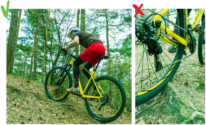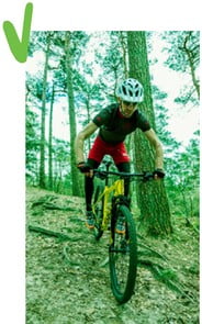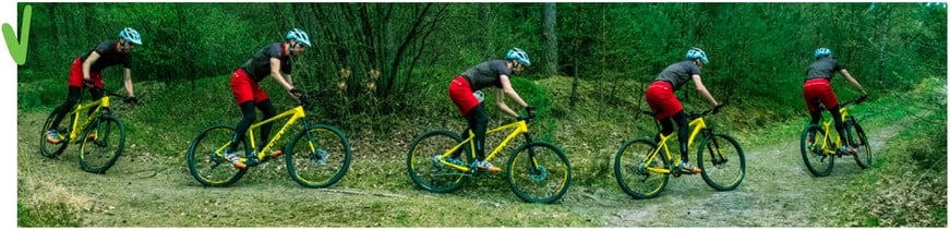 Het is belangrijk dat je je snelheid op de omstandigheden van de ondergrond afstemt. Pas bijvoorbeeld op met net opgedroogde klei of zand: die is vaak spekglad. Fiets hier zo veel mogelijk recht doorheen. Bij brede overzichtelijke paden in het bos kun je je optimale lijn voor een bocht kiezen. Als je een bocht minder scherp of hoekig maakt, dan heeft dat een aantal voordelen: » Je hebt meer grip omdat je minder schuin door de bocht gaat. Ook met relatief kleine nopjes houd je zo voldoende contact met de ondergrond.» Doordat je je snelheid kunt vasthouden, hoef je na de bocht niet vol aan te zetten. Met een goede bochtentechniek spaar je dus energie. Het is de truc om bij het ingaan van de bocht zo veel mogelijk aan de buitenkant te rijden. Vervolgens snij je de bocht aan richting de binnenkant – houd hierbij het been omhoog dat aan de binnenzijde van de bocht is. Bij het uitkomen van de bocht kun je weer de buitenkant opzoeken. Is de ondergrond glad en glij je snel weg? Zet dan meer druk op het voorwiel door je lichaams gewicht iets naar voren te verplaatsen. Je hebt met deze techniek al snel net even iets meer grip. Fiets je over een parcours met opstaande randjes aan de buitenkant? Maak daar gebruik van! Benut de randen als een kuip-bocht, zo kun je nooit de bocht uit schieten en tegelijk wel de snelheid erin houden. Kijk wel goed door de bocht heen. Zit je alleen maar te letten op die ene boom die je niet wilt raken, dan stuur je hier juist automatisch naartoe.