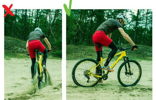 Op veel Nederlandse parcoursen en op het strand kom je rul zand tegen. Hoe kun je hier nu het beste doorheen rijden? De meest gemaakte fout is dat je je blik te kort voor je voorwiel richt. Hierdoor ga je snel slingeren en graaft het voorwiel zich vast. Of je schiet ineens opzij, waardoor je valt of in één klap stilstaat. Probeer maar eens over een witte lijn te rijden waarbij je slechts een meter voor je kijkt: dat gaat je vrijwel niet lukken! Ver voor je uitkijken is dus het devies.