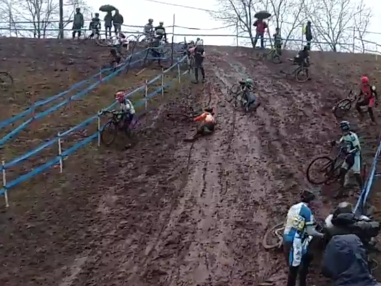 Op beelden van een Twitteraar is te zien hoe de ene na de andere veldrijder naar beneden glijdt. Geen enkele renner haalt het in zijn hoofd om fietsend beneden te geraken, want dat lijkt een onmogelijke opgave te zijn. Bekijk hieronder de beelden.