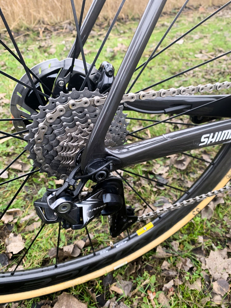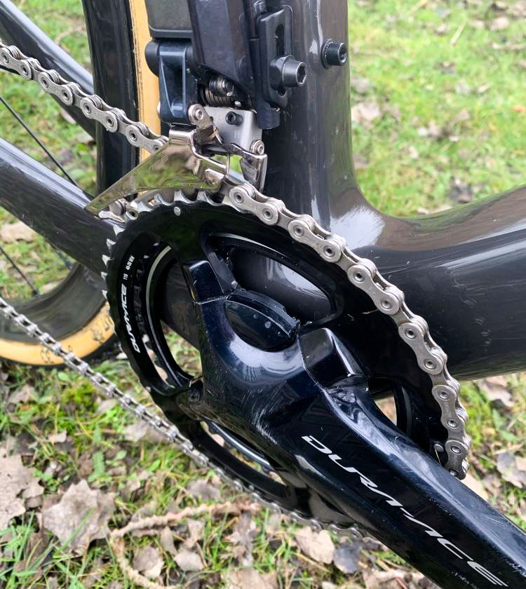 ‘Gewoon’ een crankstel met twee kettingbladen. Shimano levert Dura-Ace alleen uit als een systeem met dubbele bladen en Shimano is de sponsor. De functie van de voorderailleur is deels ook die van kettinggeleider; profs rijden vooral ‘groot-groot’. De achterderailleur zit middels een ‘direct mount’ vast. Op onze vraag waarom Wout en Marianne niet met een ODP rijden – zoals Eli Iserbyt- komt eigenlijk hetzelfde antwoord: Shimano heeft bij de 11-speed geen Oversized Derailleur Pulley.