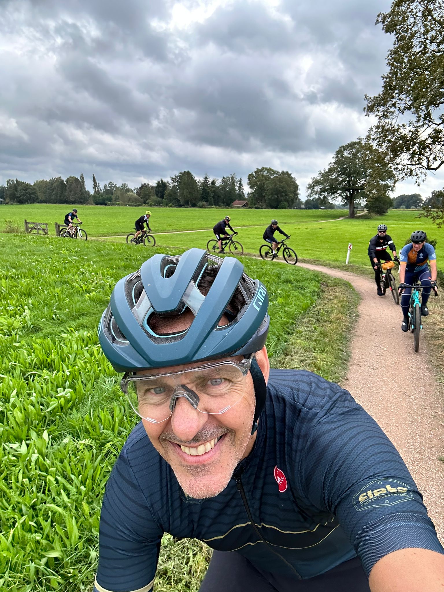 Vlak voordat de deelnemers en deelneemsters zich opstellen om te vertrekken, neemt hoofdredacteur Edwin het woord om iedereen welkom te heten. Hij vertelt dat er vandaag verschillende groepen zijn: een grote gravelgroep met drie ‘begeleiders’, een groepje mountainbikers en een groep wegfietsers. Iets na 13.00 uur vertrekt iedereen om aan de 50 kilometer lange graveltocht, een mooie mountainbikerit of 85 kilometer lange toertocht te beginnen.
