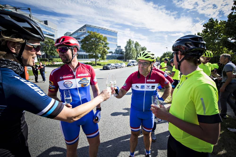 Om 22.00 uur klinkt het startsein en weg zijn we. ‘We’, dat is een groep van pakweg 30 man bestaande uit een mix van onze Giant-gastheren, zo’n 20 ‘gewone’ deelnemers én een afvaardiging Giant-topsporters, met onder meer shorttrackers Sjinkie Knegt en Suzanne Schulting en regerend wereldkampioene windsurfen Lilian de Geus. De gewone deelnemers zijn geselecteerd uit een boel aanmeldingen. Belangrijkste voorwaarden voor deelname: een Giant en een stevige conditie, want de afstand is flink en het tijdschema redelijk strak. ’s Ochtends vroeg staat een meet & greet bij het CCC-team in Brussel gepland. Het is een Tour Ride in de meest letterlijke zin van het woord: we rijden écht naar de Tour. Twee jaar geleden deed Giant dat voor het eerst. De rit naar Düsseldorf was regenachtig en het regende ook lekke banden, maar het smaakte naar meer. De Giant-rijders die vanavond van de partij zijn boffen maar met hun uitverkiezing.