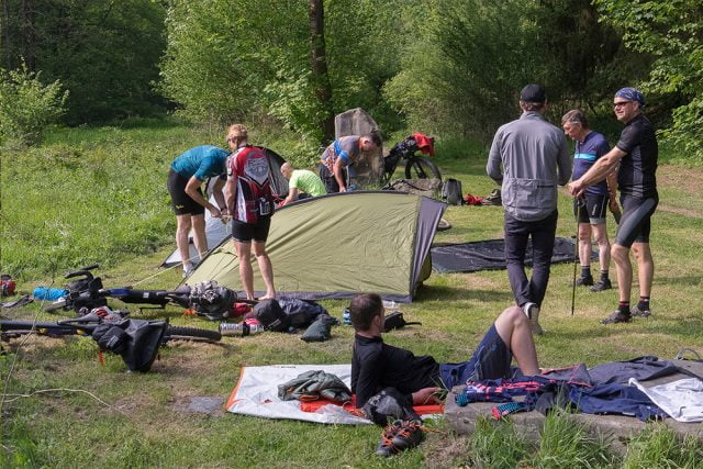 De middag wordt gebruikt om sterke verhalen uit te wisselen, lui op je luchtbed te genieten van de natuur en onbeperkt biertjes weg te tikken die je wel of niet verdient hebt. Geen vrieskou de tweede nacht, maar wel een dreigende lucht en wat druppels. Maar dat mag de pret niet drukken. Fris en fruitig komt menigeen zijn bed uitgerold en worden uit allerlei tassen percolators tevoorschijn getoverd. Fietsers zijn cafeïnejunkies en voor er gefietst wordt eerst een koffietje!