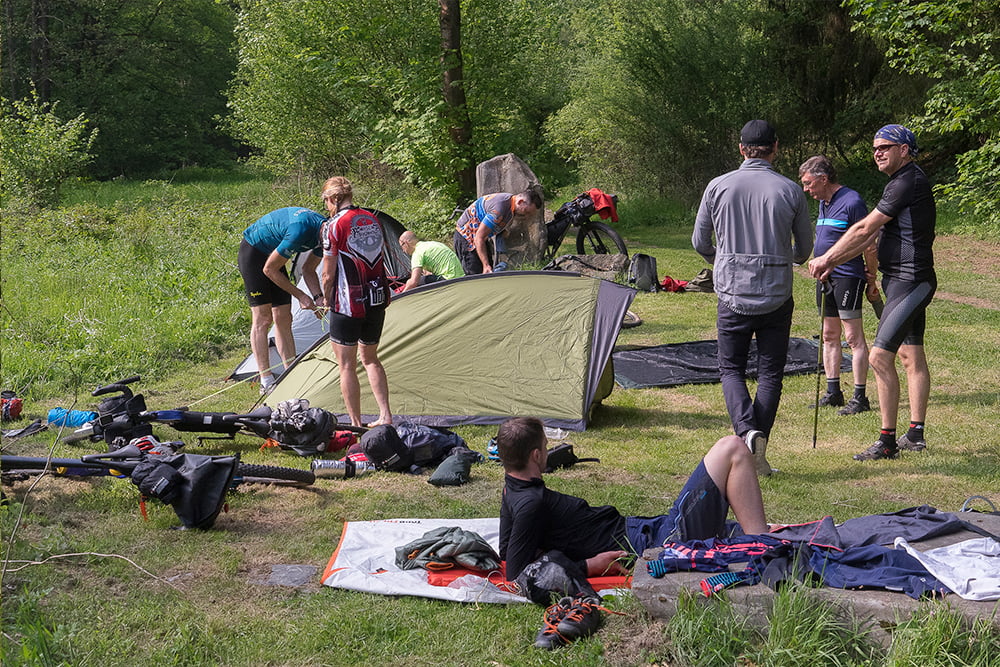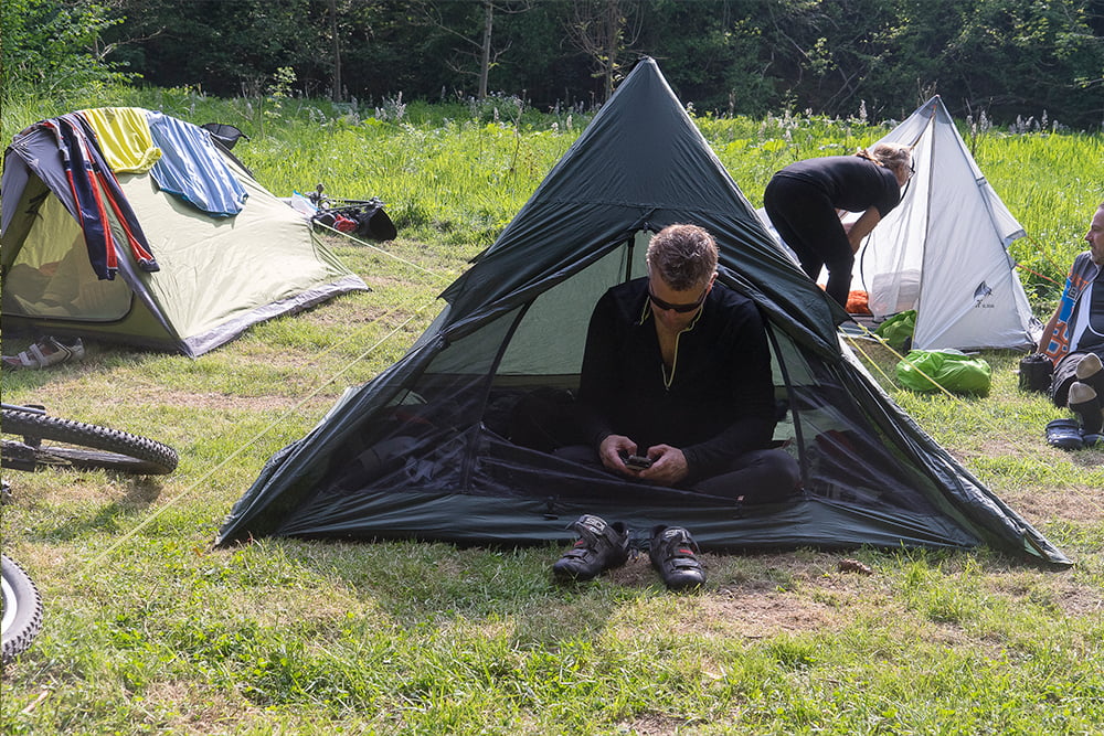 Een kleine 100 kilometer wordt afgelegd voordat ik mijn fiets omtover in caravan. Op een gezellig drukke camping met festivalsfeer heeft iedereen zijn eigen slaaptactiek. De één trekt een volledig geïsoleerde tent uit de hoge hoed, terwijl de ander alleen een hangmat of zoals ik een tarp/doek bij zich heeft.