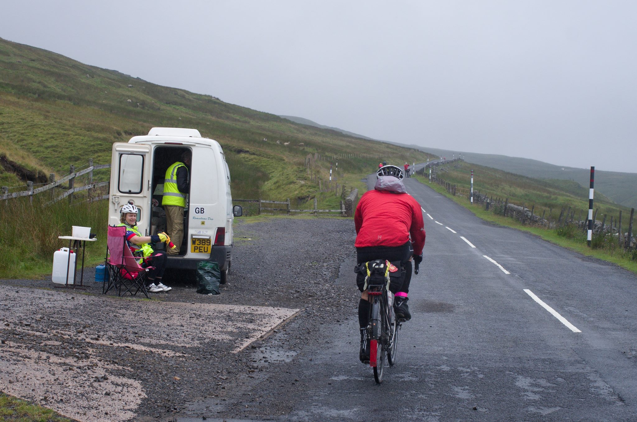 De meest bijzondere controle trof ik op de terugweg naar het zuiden, even na Alston op Yad Moss. Een oud aftandse camper, waar een vrijwilliger verse koffie en thee serveerde. Geen lekkerdere koffie gehad op welke controle dan ook dan hier in het campingstoeltje! Toen ik hier kwam om tien uur 's avonds was de wind gaan liggen en miezerde het wat en had ik wat lichte regen. Naast de camper stond een fel rode lamp.