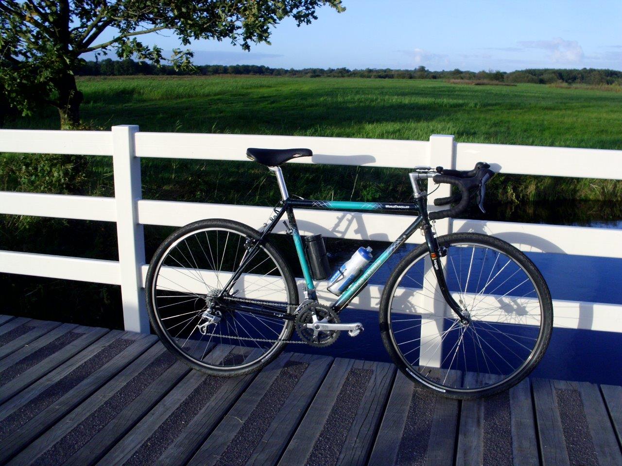 Vanmiddag vier uurtjes gefietst met de nieuwe dikke banden, met pak' m beet twee bar erin. Remmen iets bijgesteld, liepen wat tegen de banden aan. Het rijdt zeer goed, wat zwaar op het asfalt, maar veel grip.