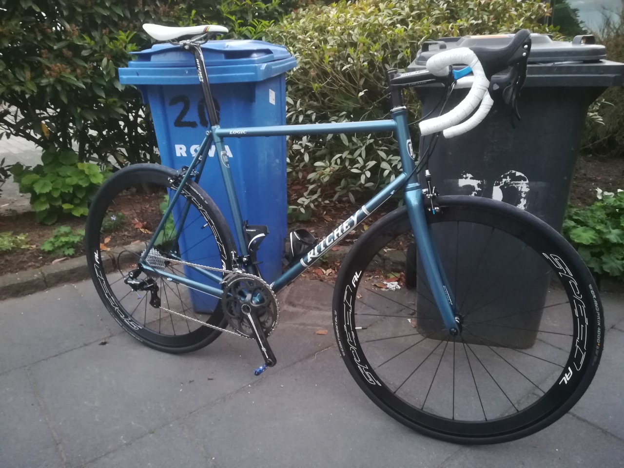afgelopen week mijn eerste ritten gemaakt op mijn zelf opgebouwde Ritchey Road Logic. Ik ben erg in min nopjes met het rijgedrag van deze fiets. De fiets stuurt erg strak vergeleken met mijn carbonnen Specilzed Tarmac maar voelt ook erg comfortabel aan. Met een "Big Smile" mijn eerste ritten gemaakt. Laat de kilometers maar komen. De fiets is opgebouwd met een Campagnolo Potenze groep en een carbon Athena Crankstel. Afgemonteerd met natuurlijk Ritchey WCS en Veltec Speed AL wielen