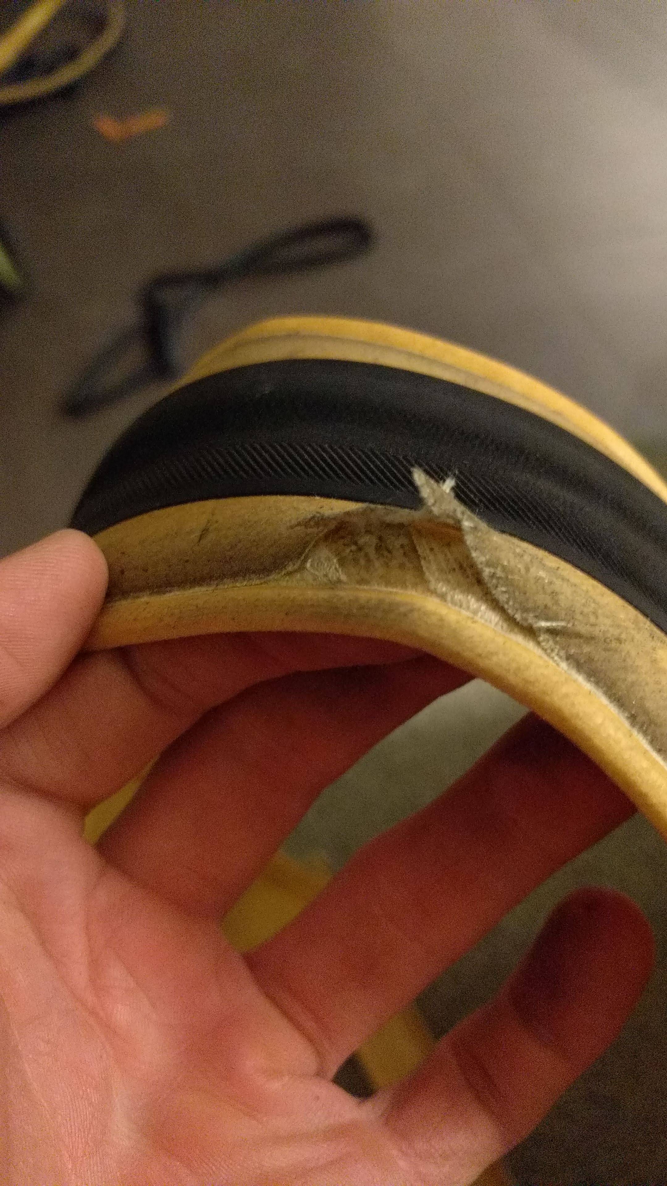 Oorzaak zal ik zo snel niet weten, maar de band is begonnen met scheuren boven de hieldraad. Ik rij er mee met carbon wielen, maar die zijn niet echt scherp. Bandje is er van het voorjaar opgezet en ik rij de 25mm met maximaal 7 bar. Ik heb er nog één liggen, die gooi ik er eerst op. Maar ik reed nu vlak voor een bocht lek, in de bocht was het vast niet zo goed afgelopen..
