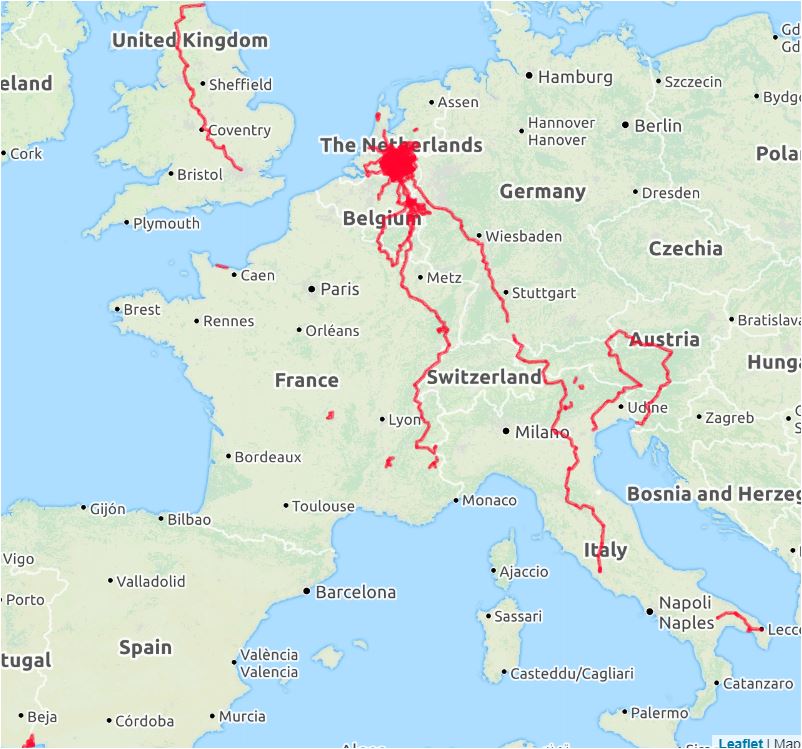 Mijn score. In 2005 begonnen met gps, echter veel ritten niet opgeslagen. Hier en daar nog een beetje teruggevonden. Geen TransAlp, geen Berlijn-Usedom-Lübeck. De lijn Hamburg-Berlijn was een tijdrit in 2011.