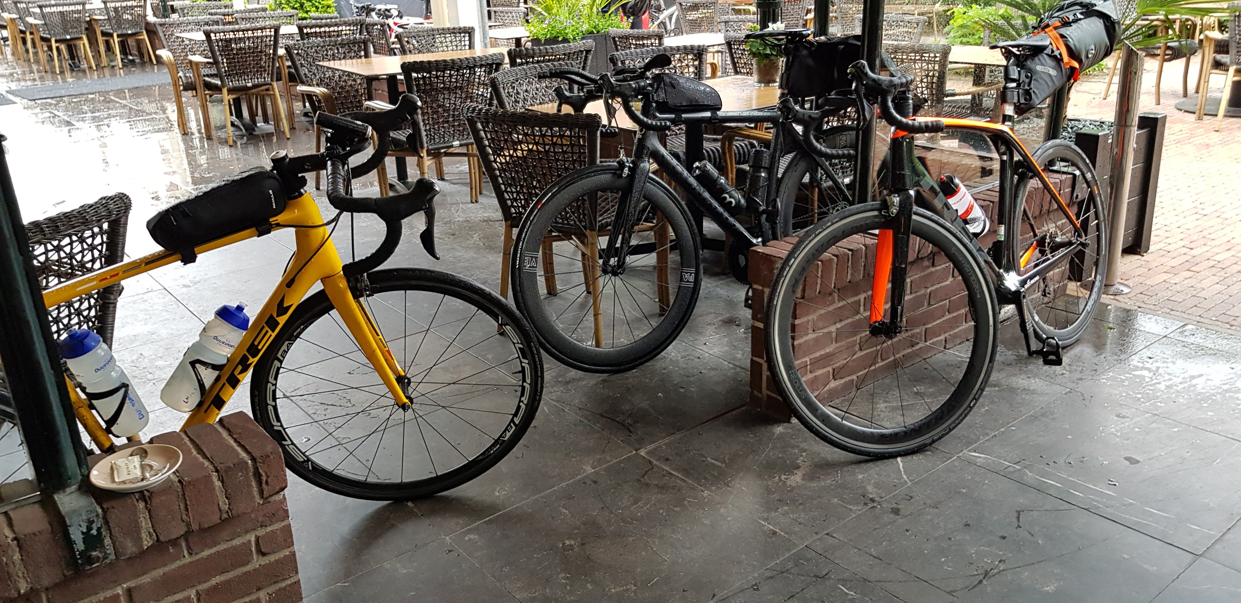 We stappen op de fiets. Iedereen, staat nu buiten en maakt zich klaar om te vertrekken. Er is een ligfietser bij, en ik zie een hoop dikke racefietsen, met carbon en schijfremmen en aero frames. Ook zit er een prachtige klassieke randonneurs fiets bij.