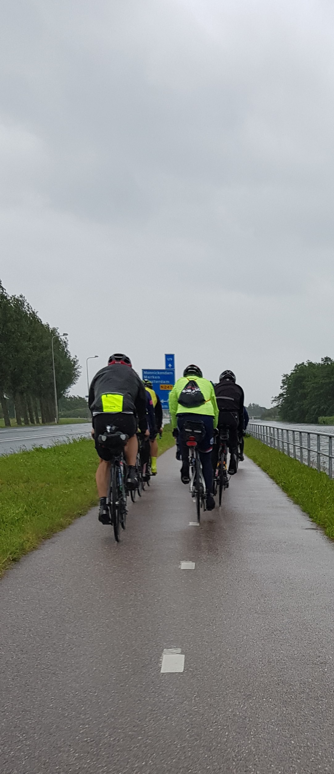 Dan begint het echt. De groep zet aan en iedereen is nog bij elkaar. de lange afstanden over de fietspaden worden weg getikt en met de wind in de rug vlot het aardig en rijden we noordwaarts. Het regent een beetje maar niet echt hard. De tape op mijn schoenen doet zijn werk, alles is lekker droog. Ik realiseer mij dat dit anders wordt, maar geniet van het nu. Met zorgen komen we niet verder. Ik laat het over mij heen komen.