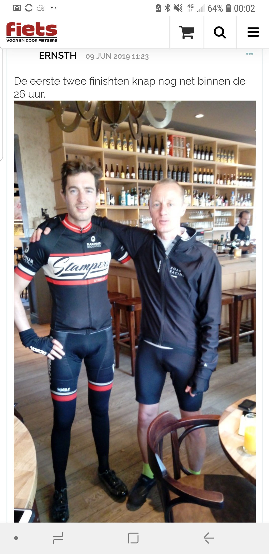 Het terras zit al aardig vol met mensen, waaronder een grote groep wielrenners. Ik kan maar amper van de fiets afstappen en loop naar binnen, daar zit Ernst en de dame die er ook bij het vertrek was en natuurlijk Rutger. We worden op de foto gezet door Ernst. "Jullie zijn de eerste twee, gefeliciteerd!" "Dit was heel zwaar, knap gedaan van jullie!. "Een aantal gaan het mogelijk niet redden binnen de tijd" vertelt Ernst ook nog. De storm gisteren maakte dit tot een lastige BRM 600, dat was wel duidelijk.