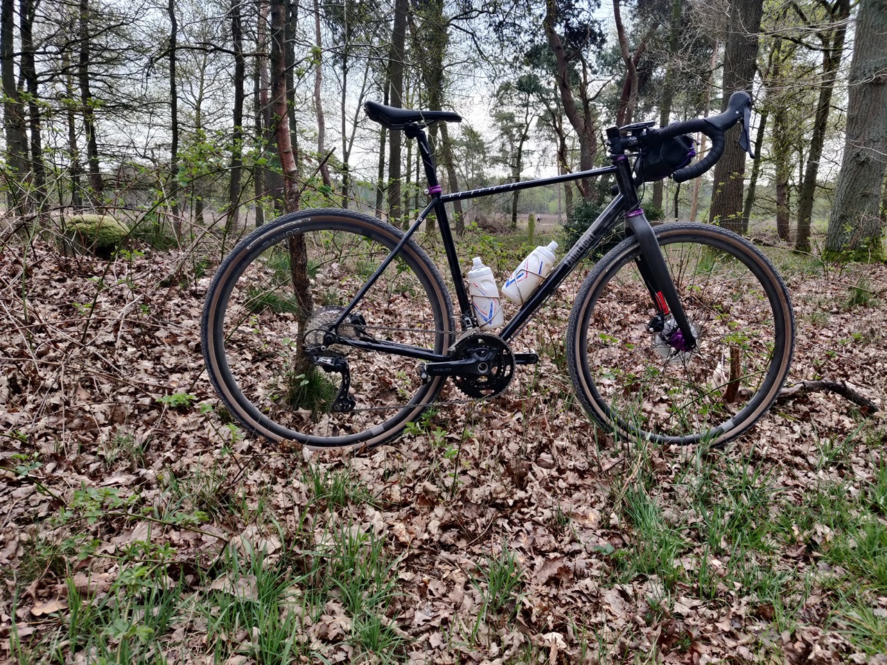 Fairlight Secan, maat 54t, glanzend zwart met paarse details (headset, zadelpenklem, hope naven). Hope wielen, Panaracer Gravelking SK bandjes (700 x 38c). Shimano GRX600 groepset, 2x11, met Ultegra remschijven (omdat ik die mooier vond)