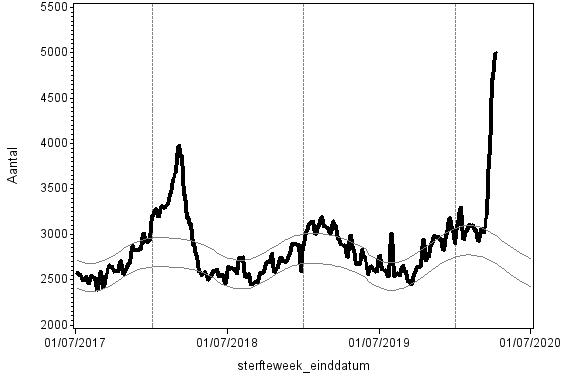 Sterfte verhoogd: de sterfte bevindt zich boven de bovenste grijze lijn.