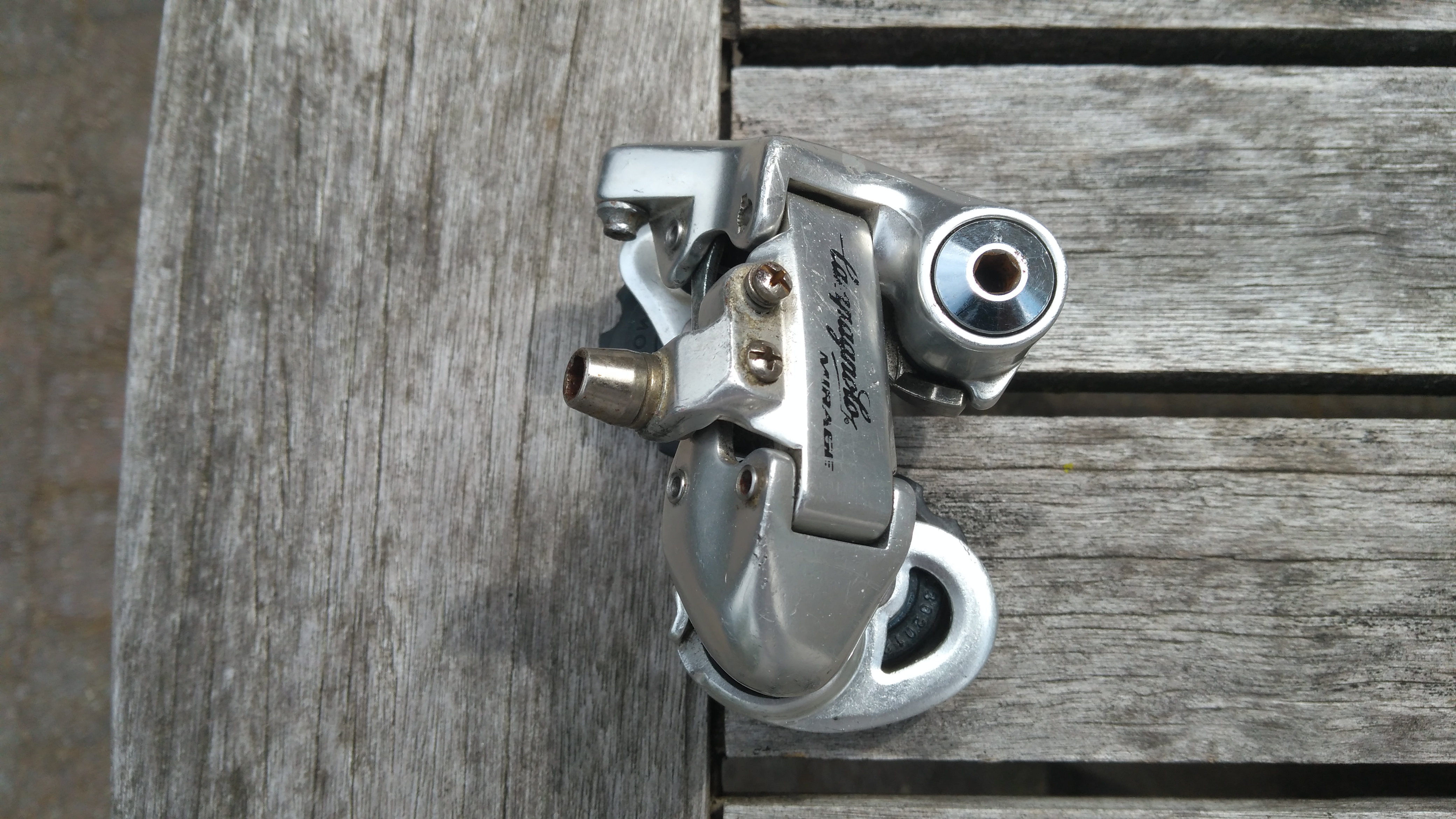 Van mijn Campagnolo Mirage, 8 speed achterderailleur is de stelschroef van de kabel op een vervelende manier afgebroken (zie vooral foto 2).