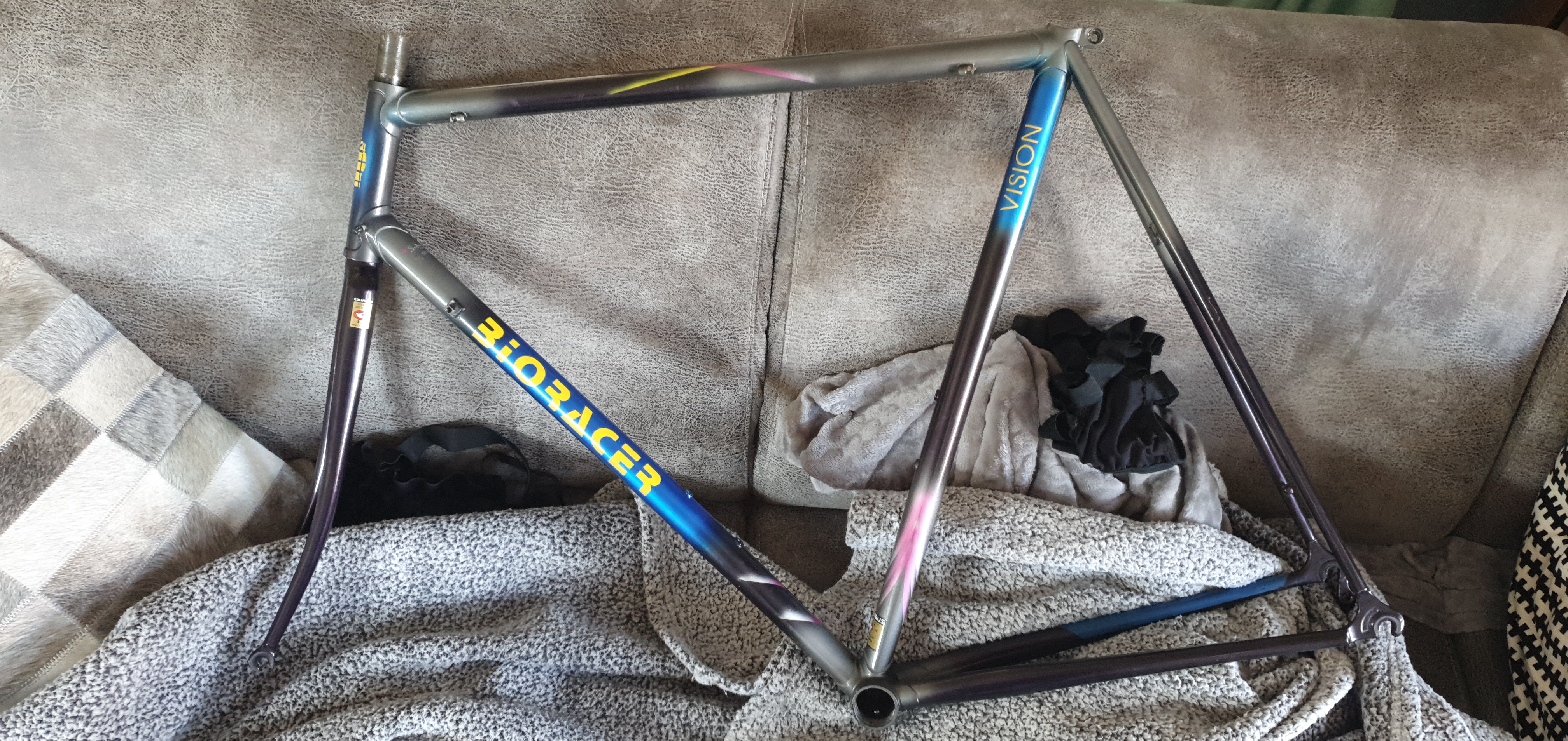 De buizenset is Columbus EL - Over size. Maat is 59ct (57.5cc) Het frame staat nog heel aardig in de lak voor de leeftijd. De donkere vlakken zijn donkerpaars. Maar dat komt er op deze foto niet echt uit. Bioracer kleding is misschien niet hip nu, maar de kwaliteit van dit frame is best wel goed. En ja je koopt daardoor zo een frame nu voor een prikkie. Dit moet toch een paar duizend gulden gekost hebben toen ik naar de peuterschool ging.