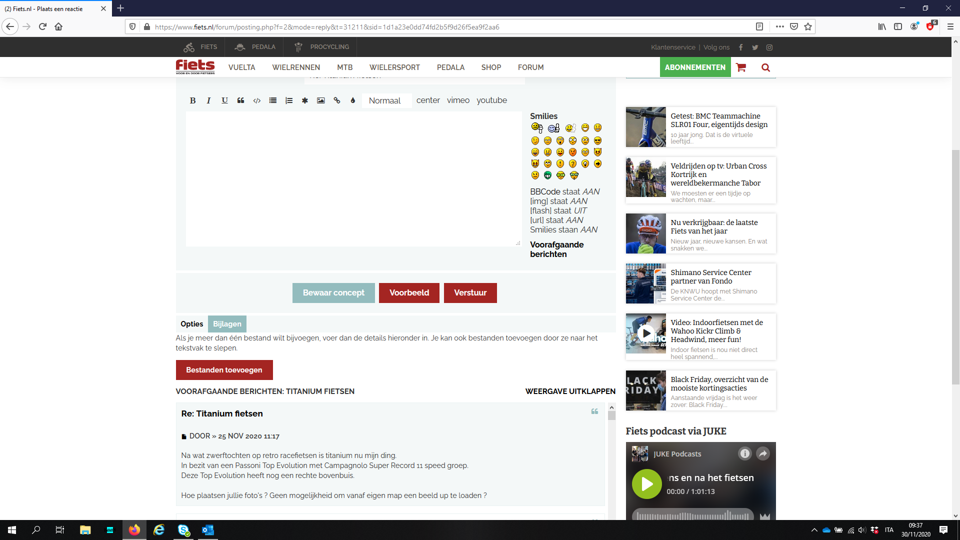 Klik op "Volledige bewerker en voorbeeld" of op "Plaats Reactie". Onder het tekstvak kan je kiezen tussen "Opties" of "Bijlagen". Via bijlagen kan je een foto uploaden.