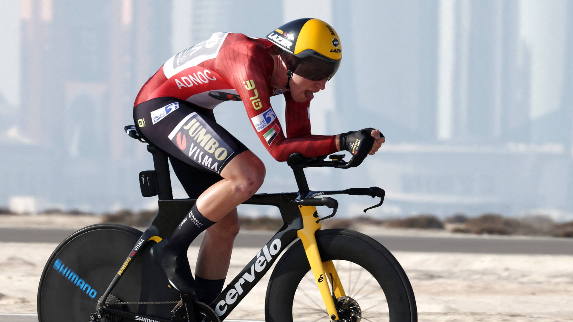 Tadej Pogacar is bezig aan de tijdrit AFP