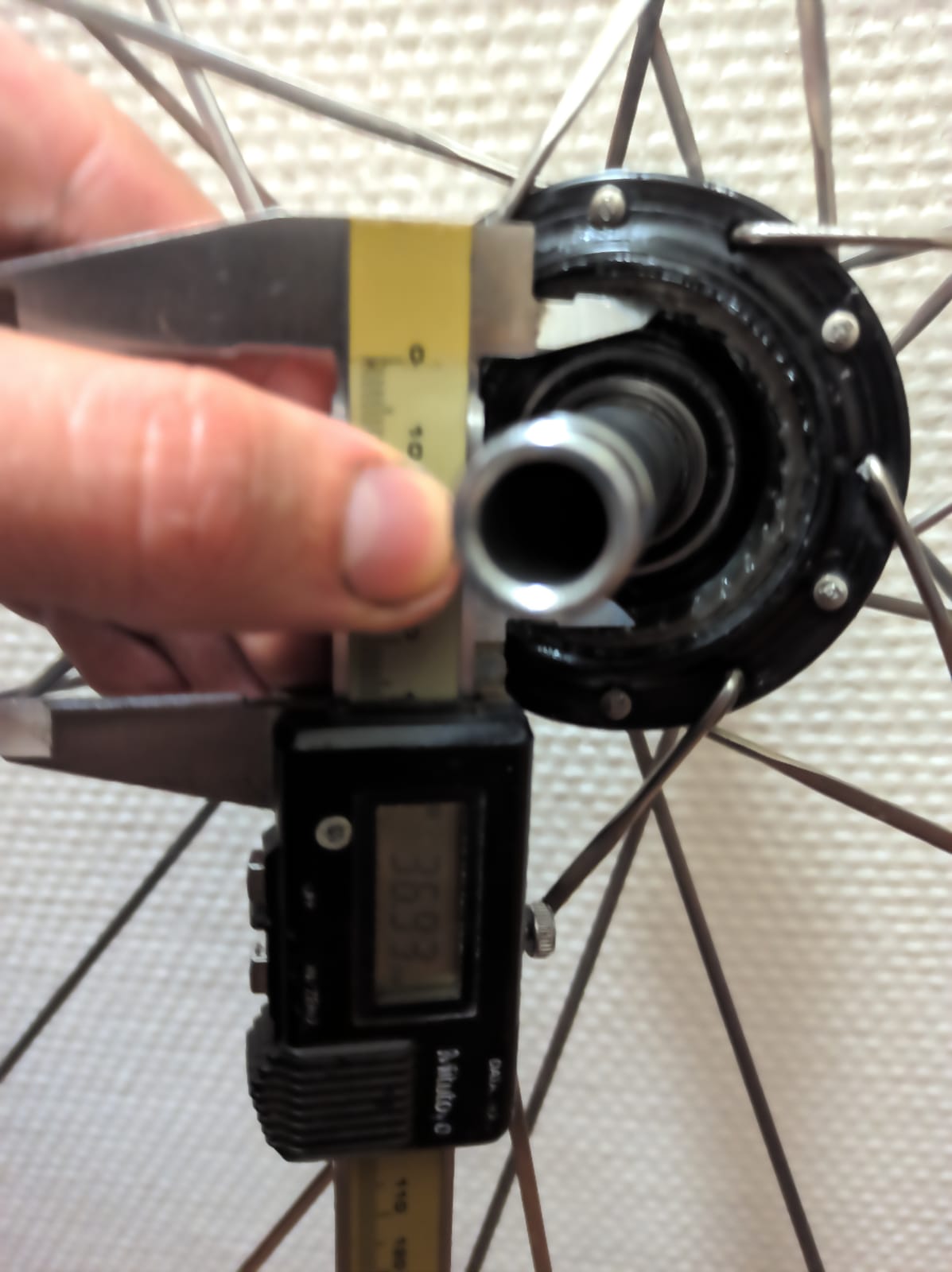 Binnenmaat body in de naaf, hier heb gemeten dat een zipp 176/177 XDR hub ogenschijnlijk zou passen, maar net minder dan 0,5mm te grote diameter heeft voor het ratel-deel om er in te kunnen passen: