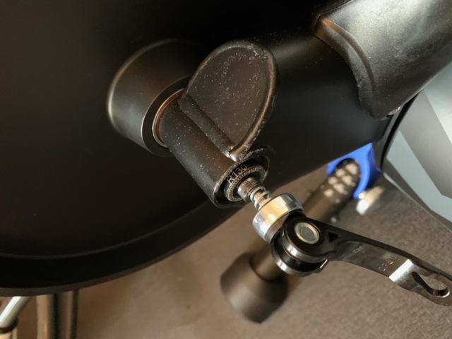 Maar nu het probleem dat de fiets niet goed vast zit op de Kickr. Ik kan de racefiets aan de cassettekant van beneden naar boven wat bewegen, terwijl de andere kant echt met kracht is vastgezet en daar geen beweging in de fiets zit. En die beweging lijkt me niet correct. Ik heb keurig de 130 mm QR gebruikt en dat is ook de juiste, bij de 135 mm past het helemaal niet nog afgezien van de 142 en 148