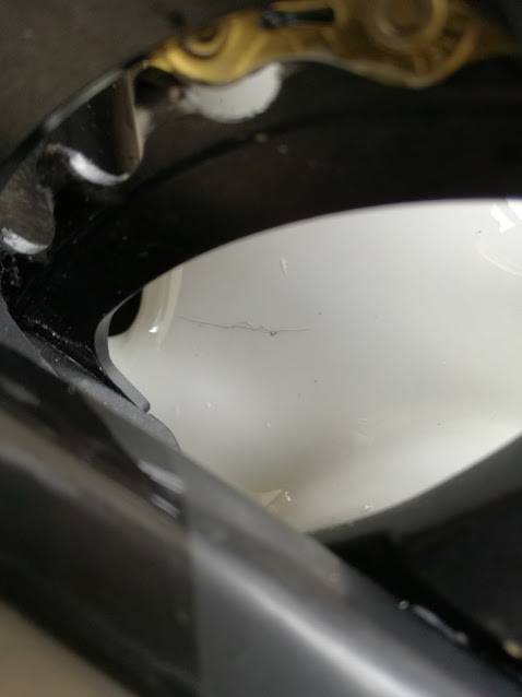 Een paar weken geleden zag ik bij het petsen van mijn fiets in een keer een scheur achter de voorste tandwielen van mijn mooie witte racefiets. Omdat er nog garantie zit op de fiets is dit uiteraard met mijn FM besproken. Resultaat: De fiets gaat terug naar de fabriek waar ze willen beoordelen of het een scheur in de lak of in het frame is.