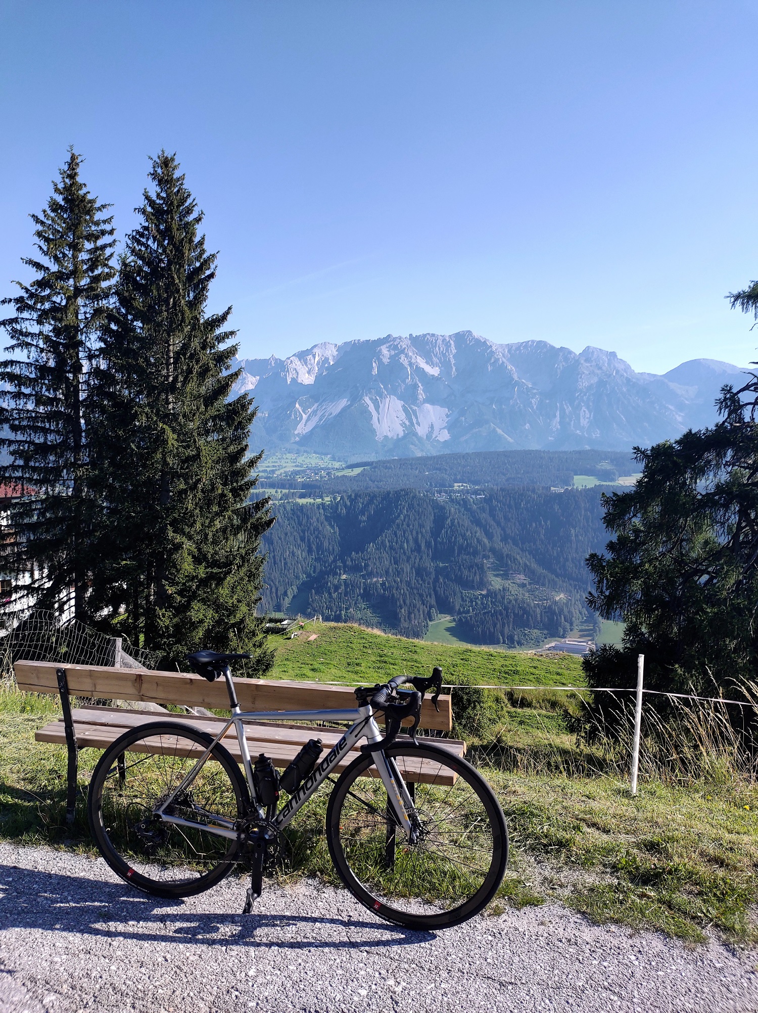 De CAAD voor mijn zoon is aangekomen in Oostenrijk. En natuurlijk ging mijn CAAD ook mee. We hebben meteen een kleine ronde gemaakt. 22km en 550hm. Even kennismaken met klimmen en dalen. En dat ging goed. Vooral het dalen wilde ik even samen doen. Hij is een mountainbike gewend met 200mm schijven. En met 75km/u remmen op een racefiets voelt iets anders. Hi jzegt: die remmen voelen niet goed aan. Haha. Ja, ten eerste is de snelheid veel hoger en rem je met kleinere schijven. Dus ja, dat is anders.