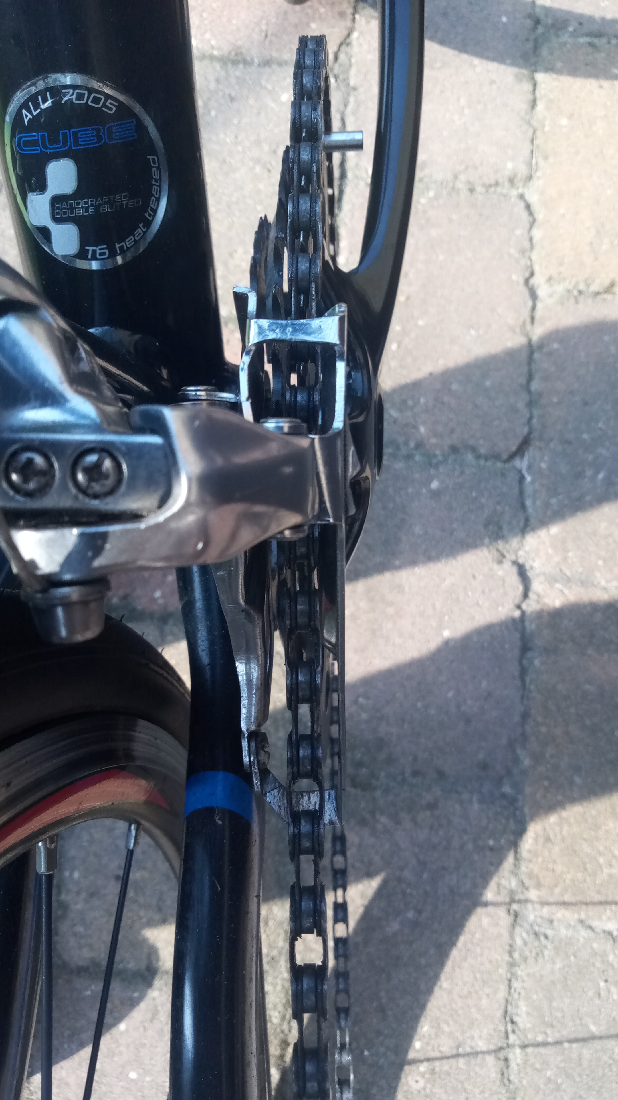 Ik heb sinds kort een racefiets gekocht (tweedehands), alleen begon hij een raar geluid te maken, en lijkt het mij dat de ketting tegen de voorderailleur aan slijt. Ook heb ik soms een beetje het idee, dat het de ketting even een paar windingen kost voordat hij in de juiste versnelling komt als ik schakel. Doe ik iets fout? Ik heb foto's bijgevoegd van de voorderailleur.