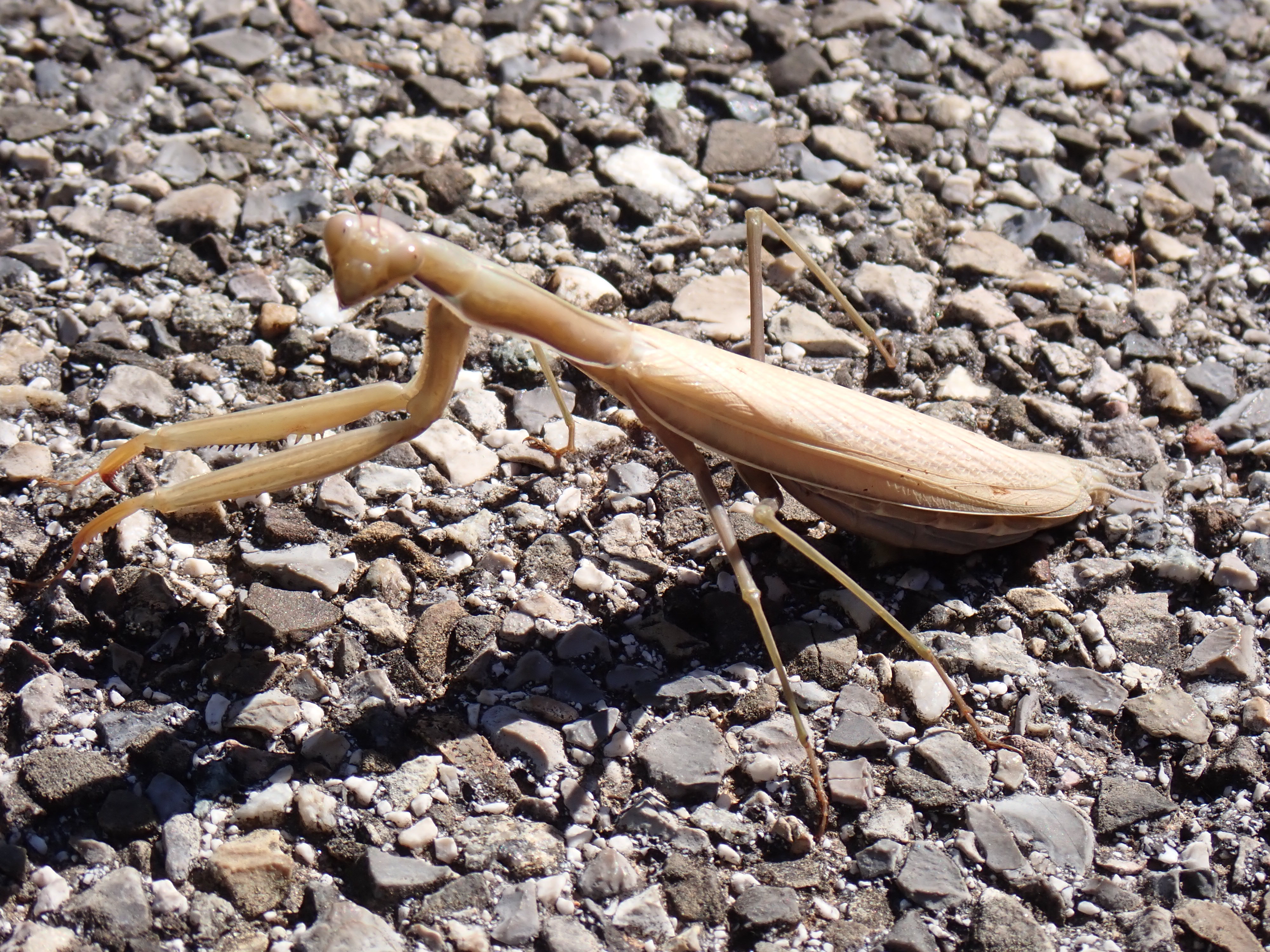 Bidsprinkhaan op het fietspad. In het naastgelegen maisveld werd hij onzichtbaar.