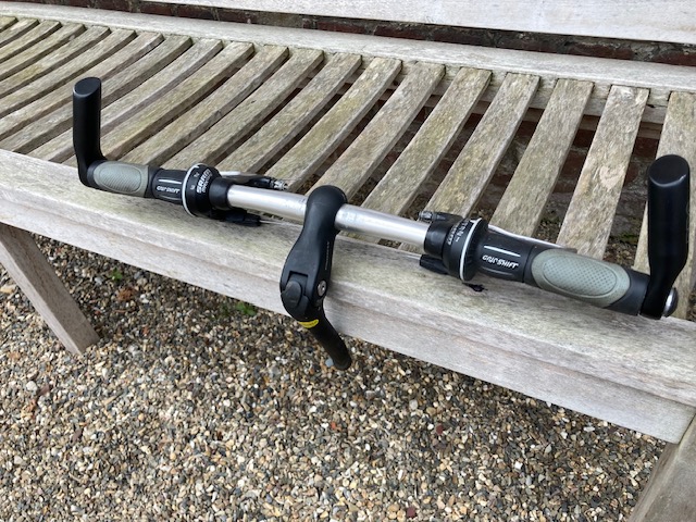 Mijn vriendin heeft een tijd geleden een nette klassieke racefiets gekocht Het betreft een Alta Vitesse met 2x6 Shimano Altus LT en frictieshifters op de buis. We hebben deze bij de eerste eigenaresse opgepikt die hem begin 80-er jaren van haar zuurverdiende spaargeld gekocht had. De fiets ziet er op zich prima uit, maar mijn vriendin kan niet overweg met de buisshifters, waardoor de fiets meer in de garage op zolder staat dan ie gebruikt wordt. Tevens wil ze graag naar een recht stuur. Dit wordt een soort MTB-stuur. Vooral de shifters vormen nu een probleem, want ik kan niks vinden dat werkt en enigszins binnen budget ligt.