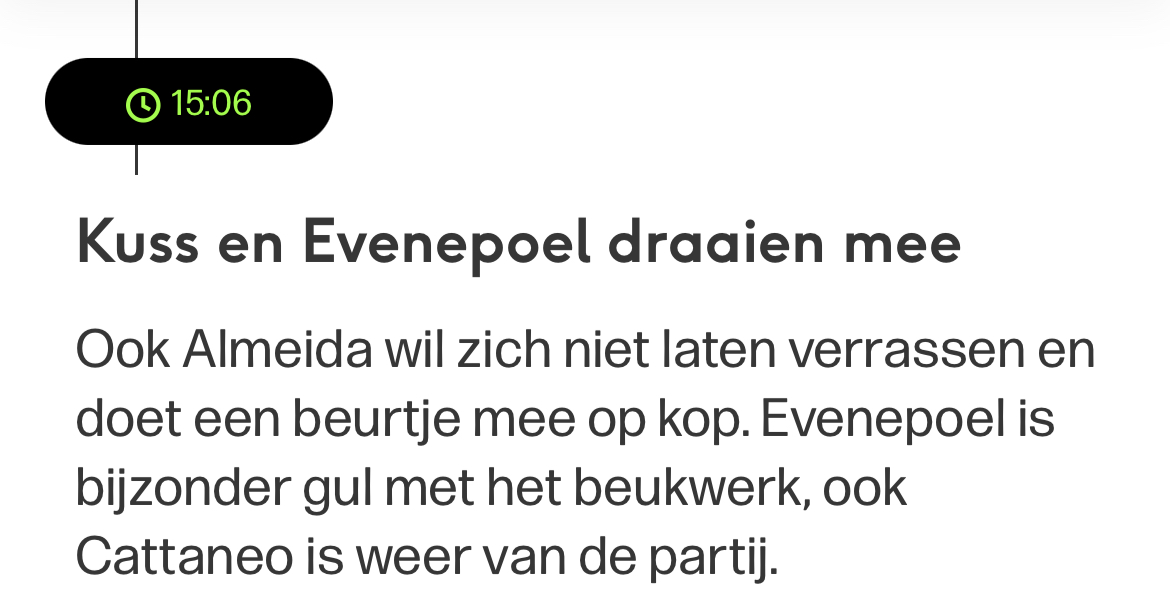 Haha niet m’n bedoeling om je terecht te wijzen hoor!! Meer even duiden dat Remco waarschijnlijk weinig extra energie verbruikt heeft in die waaieroorlog van in het begin van de etappe.