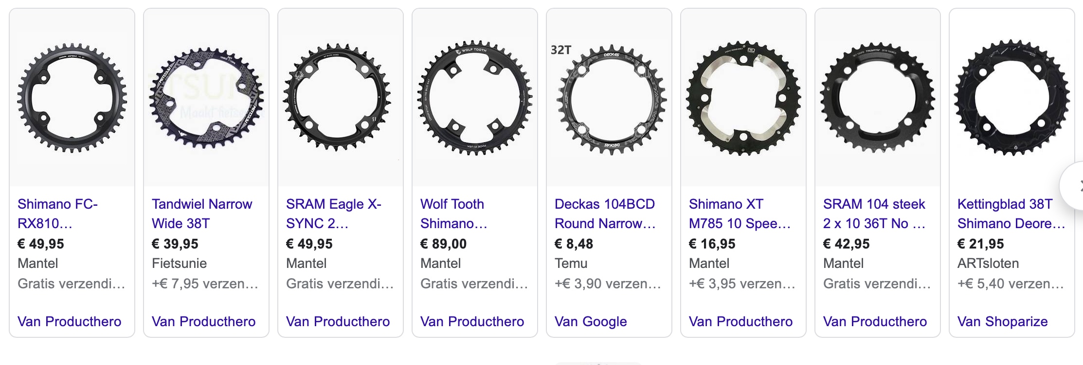 Ik vond dat ook erg vreemd maar het is echt zo.scepticus schreef: ↑14 sep 2023 20:085 Gazelle dealers kunnen je niet aan een 104mm BDC 38t blad helpen?RobOssewaarde schreef: ↑14 sep 2023 17:08 heb het ook gevraagd bij 5 Gazelle dealers rondom en die hebben ze niet.