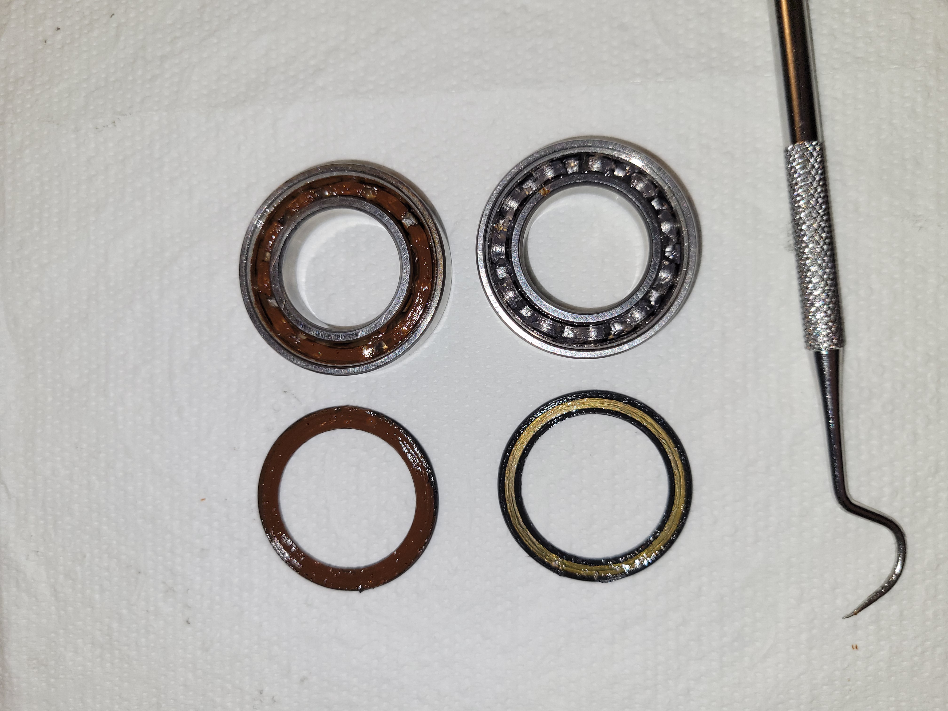 Die einddoppen haal je er zo vanaf, maar de industrielagers zijn nog steed afgeschermd met een seal, dus die moet er vanaf voordat je er vet bij kunt doen. Goede kans dat er vocht in is gekomen als je een geluidje hoort. Dan is er roest en dat zie je ook wel aan (de kleur van) het vet in de lager. De meningen zullen vast wel verschillen, maar ik zou dan een nieuwe lager monteren.