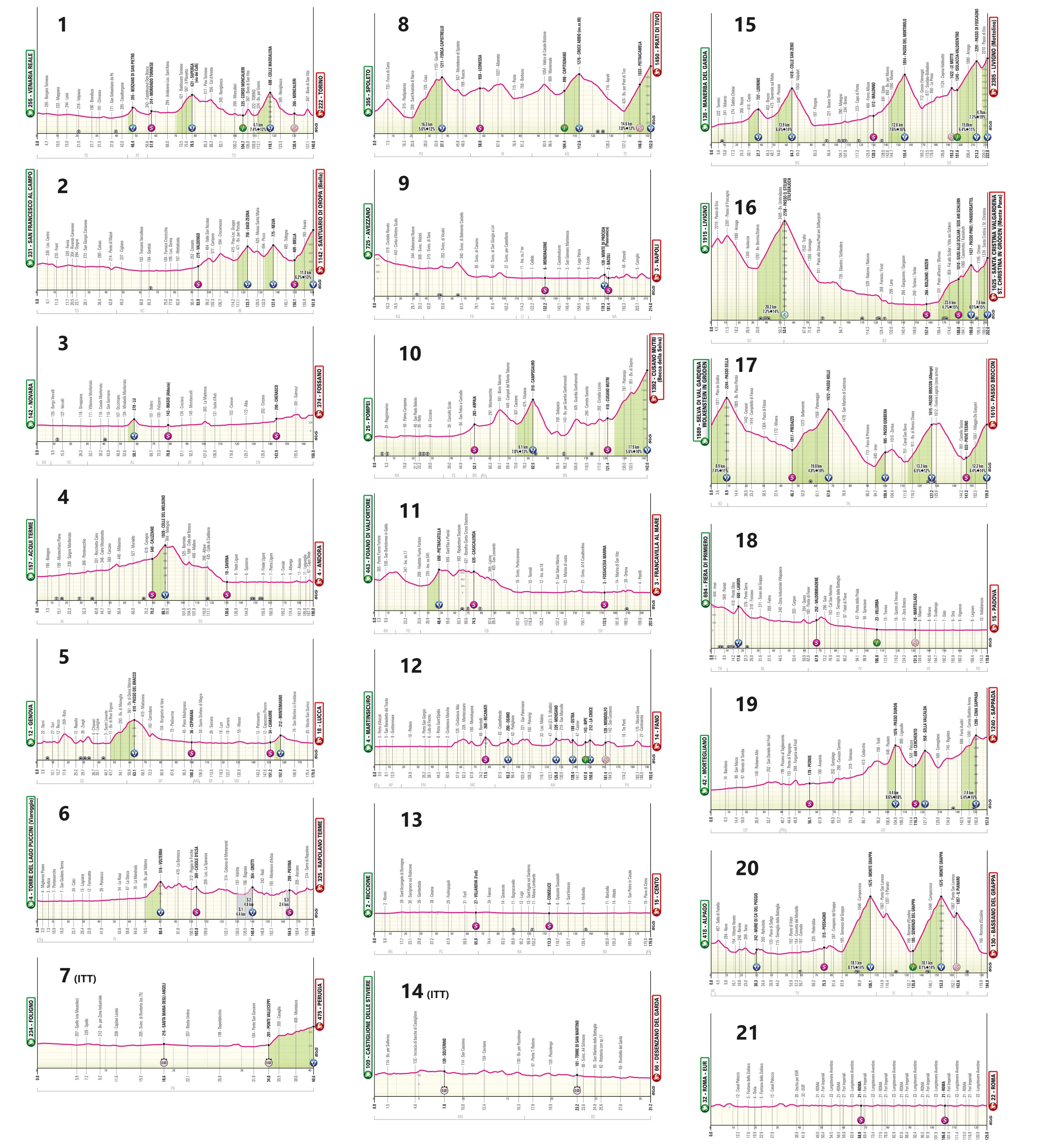 In de loodzware 15e etappe – Manerba del Garda ~ Livigno (220 km, 5600 hm) – is ogenschijnlijk toch weer zo'n geinig geitenpaadje opgenomen. Namelijk bovenop de Passo Eira linksaf nog 2 kilometer à 9,5% (max 22%) omhoog naar de finish bij de Mottolino-skilift. Dat was tot voor kort in ieder geval een 'sterrato'-weggetje, dat wellicht nog geasfalteerd wordt, of inmiddels al is? Hopelijk niet.