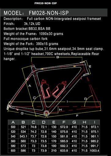 Je hebt van de FM028 ook een versie met ISP (Integrated Seat Post). De geometrie van dit frame is hetzelfde alleen komt er 200mm bij voor de zitbuis. (Dus 60cm non-ISP is 80cm ISP).