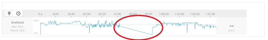 Nu zie ik wat het probleem is. De tijd dat we pauze nemen, telt de V650 erbij op ... en dat gaat je gemiddelde automatisch flink naar beneden (zie ook bovenstaande foto van de rit).