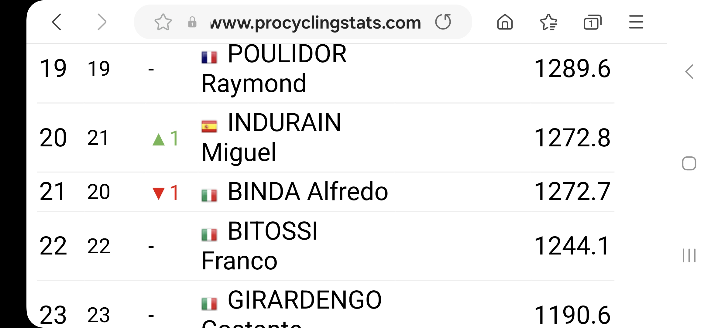 Zonde dat ze Armstrong trouwens uit dat lijstje geschrapt hebben, die moet rond de 1600punten zitten ((10000+33tour etappes (3300) + 7 touroverwinningen (3500))/10) en dan ben ik nog niet zeker of ik alleen die tourzeges er nog bij moet tellen of dat er nog meer geschrapt is? Daarmee staat hij in elk geval net in de top 10.