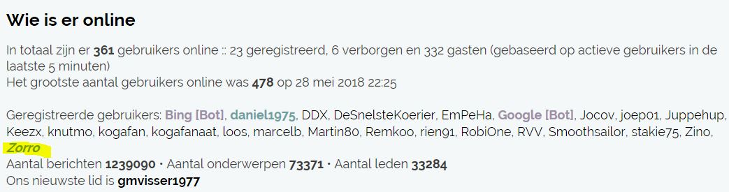 In totaal zijn er 389 gebruikers online :: 23 geregistreerd, 4 verborgen en 362 gasten