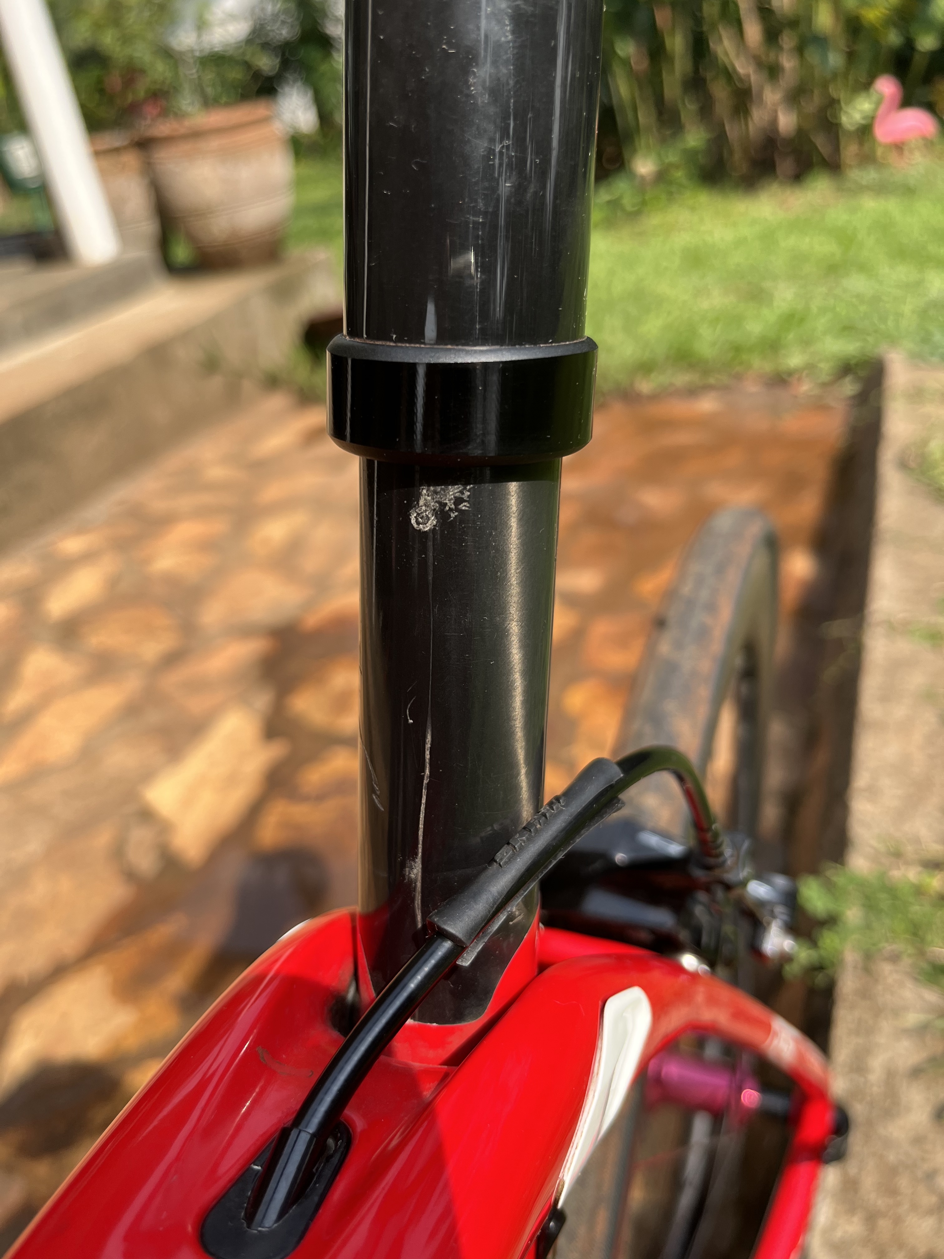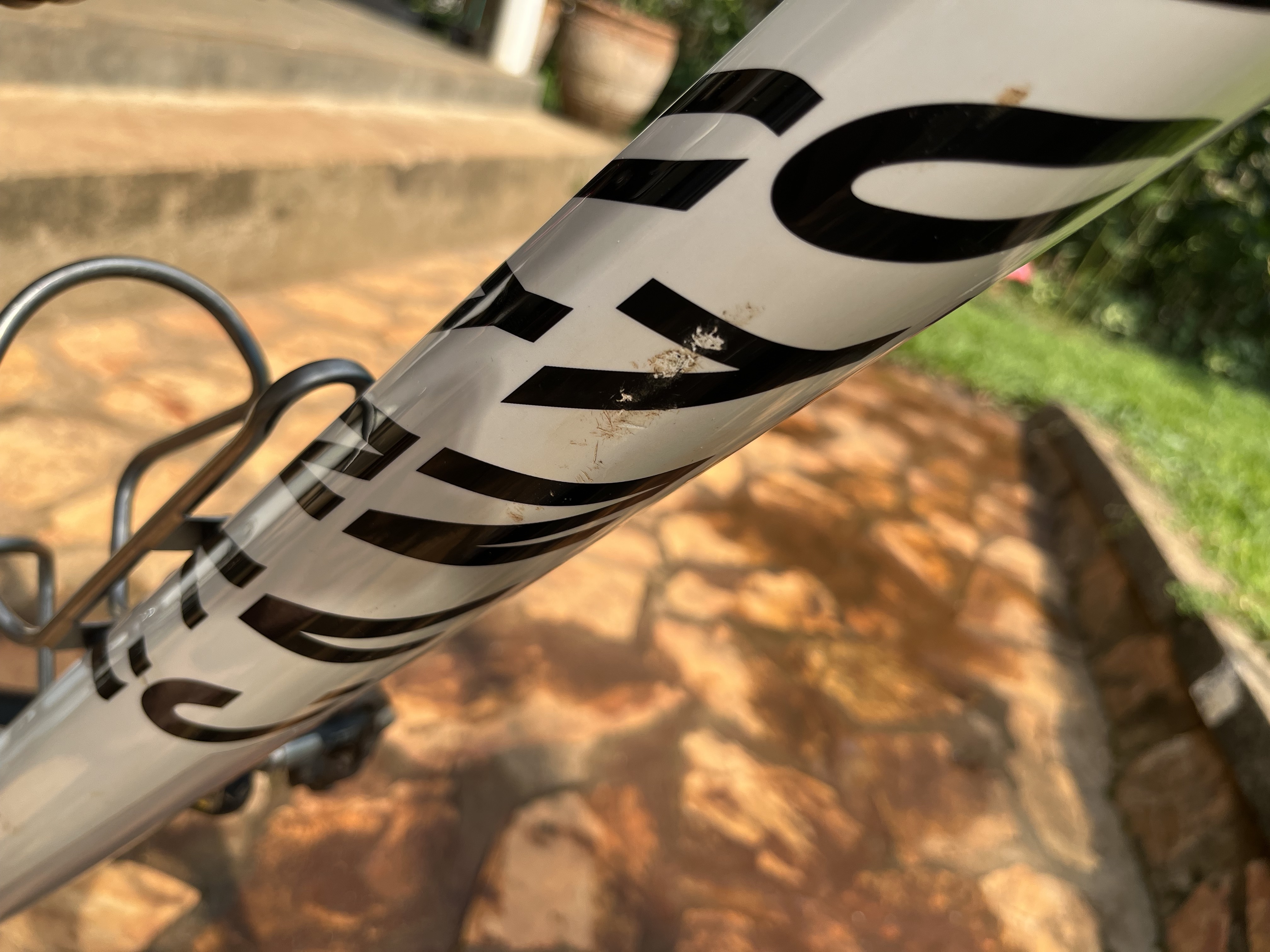 Van de Canyon maakte ik mij zorgen vanwege het hoogteverschil dat je kan voelen op de plek van de beschadiging. Ik denk echter bij nader inzien dat dit eerder komt door de stickers die op die plek beschadigd zijn dan door carbonschade. Bijgevoegd foto's: