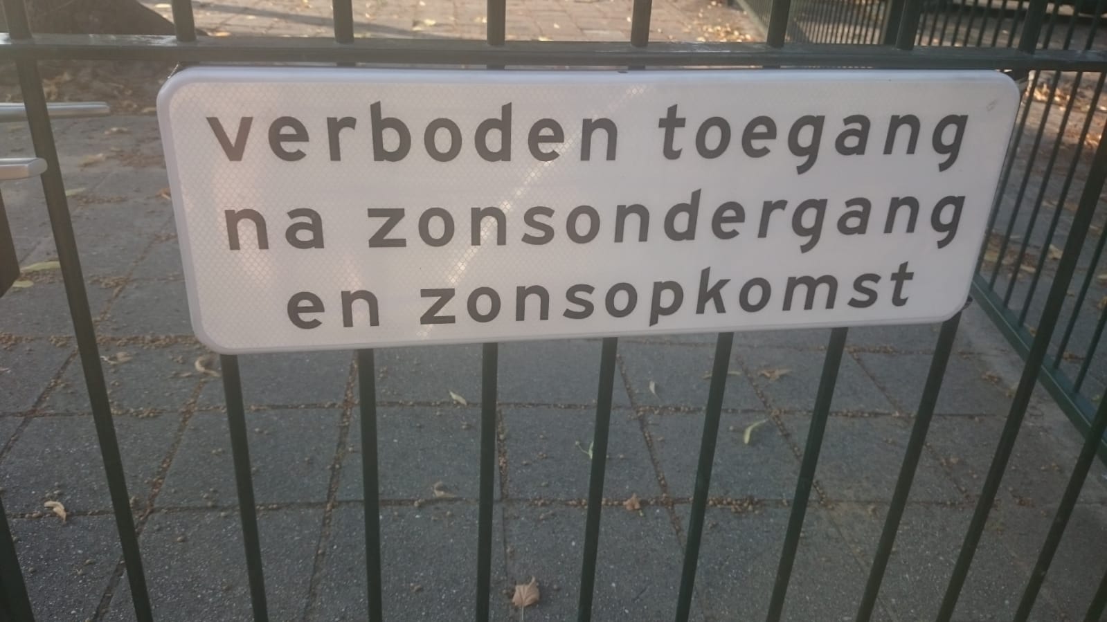 De ironie, het bord hangt aan een poortje van een lagere school.